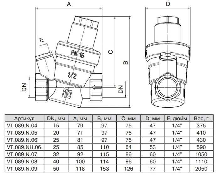 Редуктор давления VT.089 мембранный латунь под манометр Ду25 Ру16 ВР/ВР (1-5бар) 80С (40/1) Valtec VT.089.N.06